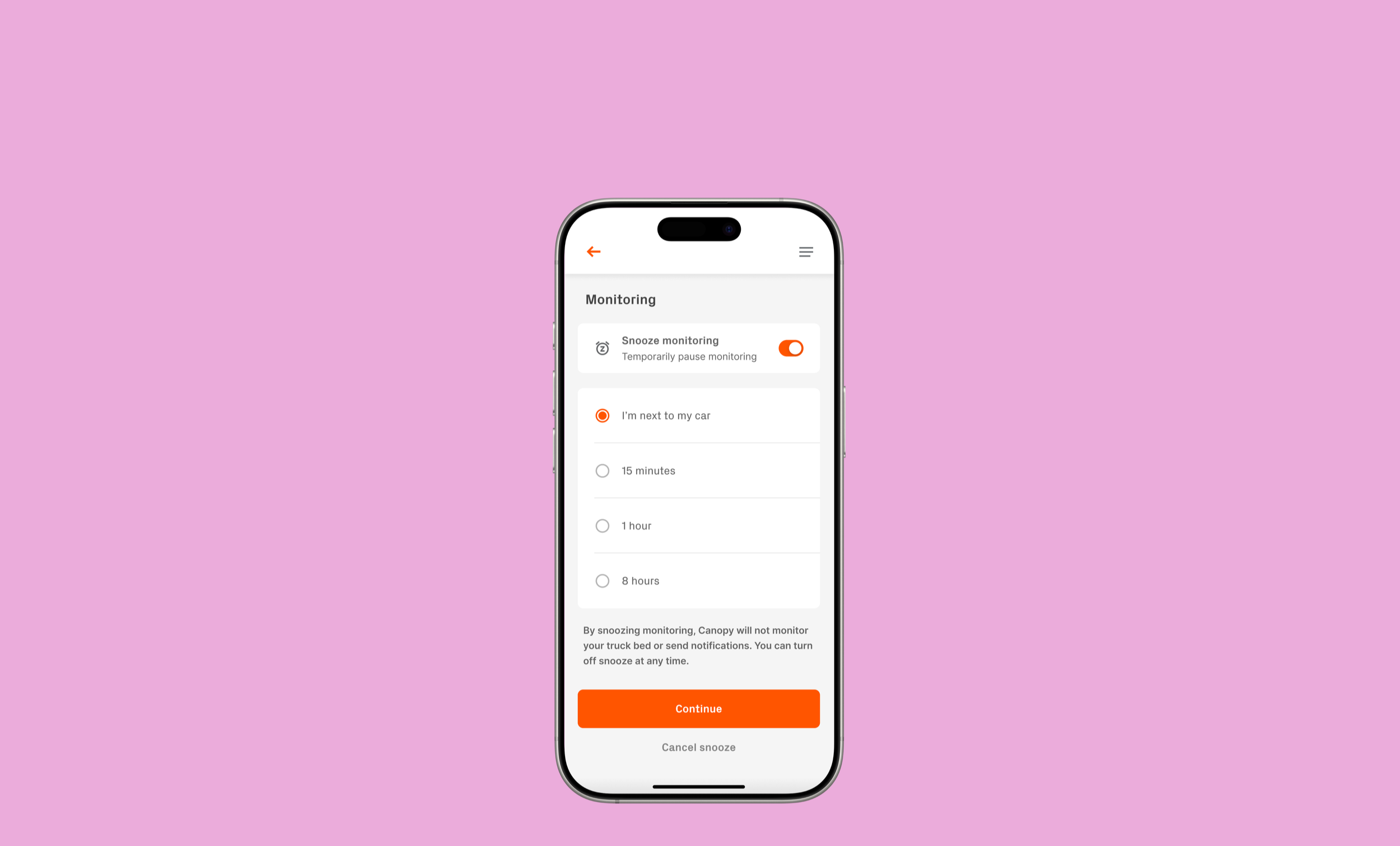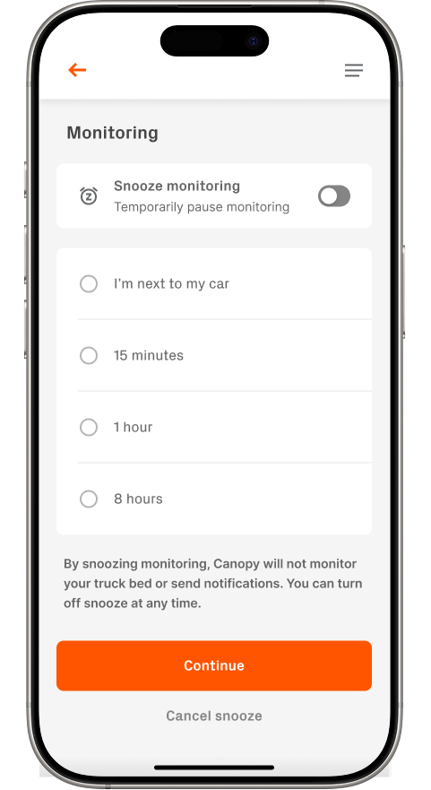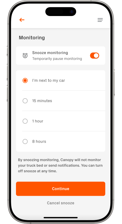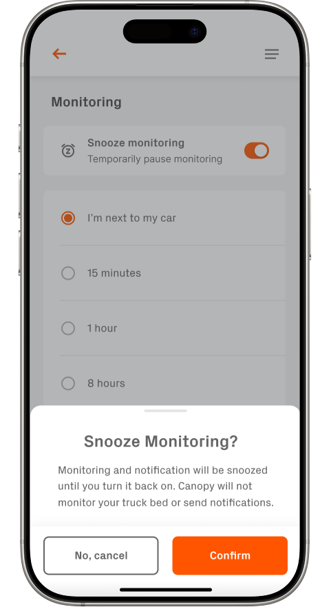 From the device page, users can access the Monitoring menu where they’re presented with the option to toggle Snooze Monitoring. They can choose from time-based options or activity-based presets—like “I’m next to my car”, which keeps monitoring off until manually resumed.